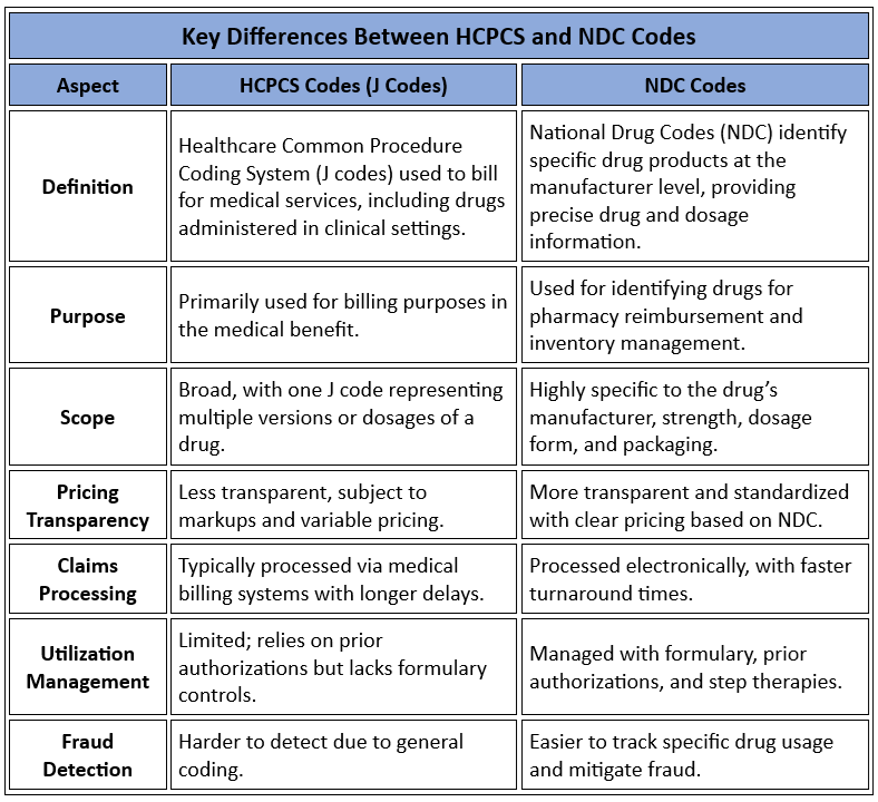 As pharmacy benefit managers (PBMs) and health plan sponsors face increasing pressure to manage costs without compromising care, one of the most effective strategies is moving J code drugs from medical to pharmacy benefit. This approach can streamline administration, increase transparency, and create more predictable pricing structures for stakeholders. In this blog, we’ll explore the benefits of this transition, and I’ll explain the key differences between HCPCS and NDC codes through a simple table.
